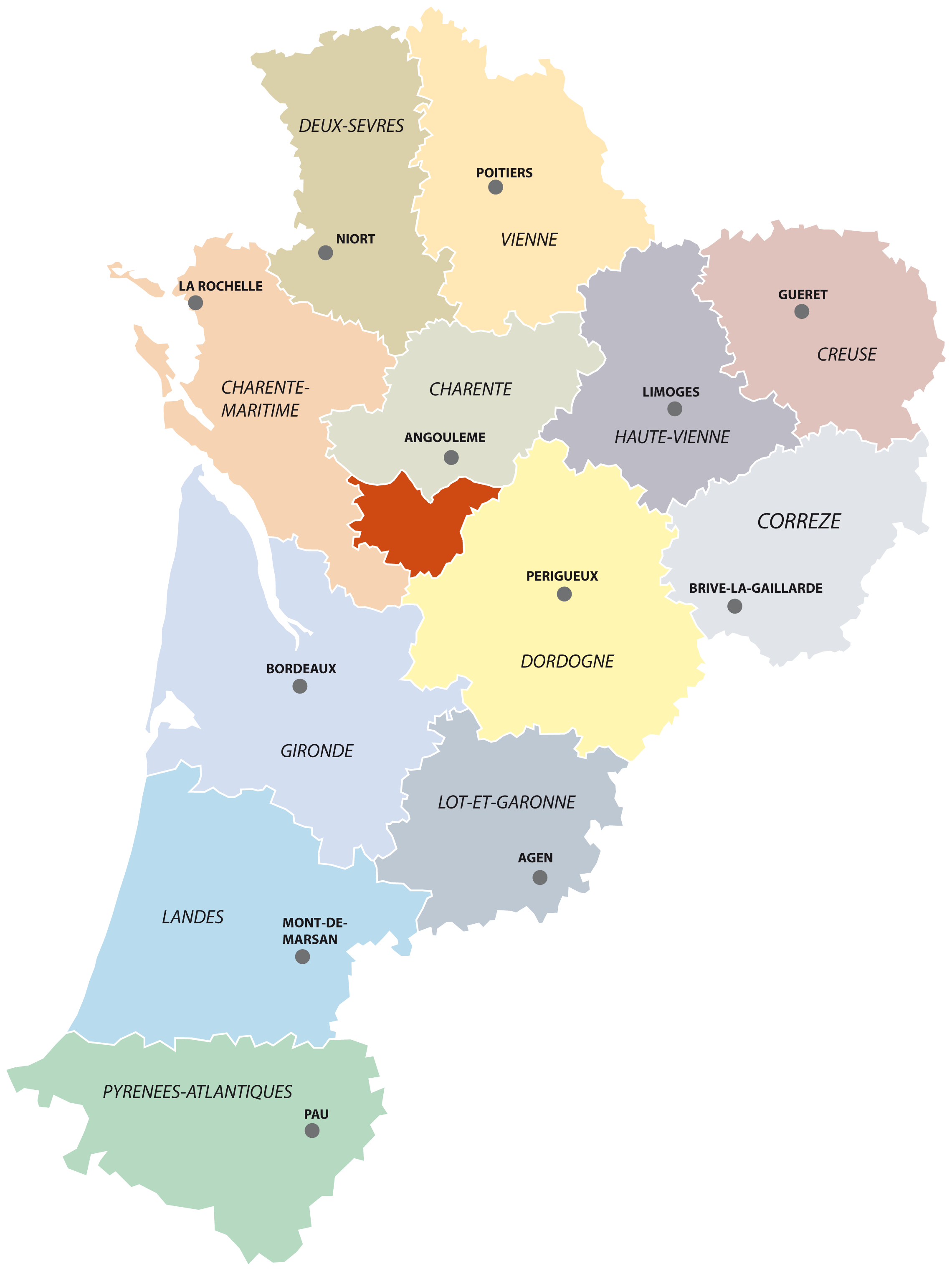 Le Sud Charente est situé au cœur de la Nouvelle-Aquitaine. Le territoire est issu pour partie de deux anciennes provinces : la Saintonge et l’Angoumois. Aux portes du Périgord, situé entre Cognac, Angoulême et Bordeaux, et à moins de trois heures de Paris.